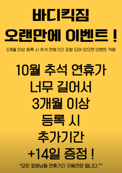 갤러리 카테고리 추석연휴 이벤트! 등록일 2025-09-05 바디킥짐 추석 연휴가 길어 연장이벤트를 진행합니다! 3개월 이상 등록 시 14일을 추가로 증정드립니다! *모든 회원님들은 연휴기간 동안 회원권은 자동으로 연장됩니다 이전글 바디킥짐 2주년 기념 이벤트 ! 다음글 3월에도 출석 이벤트는 계속된다! 목록